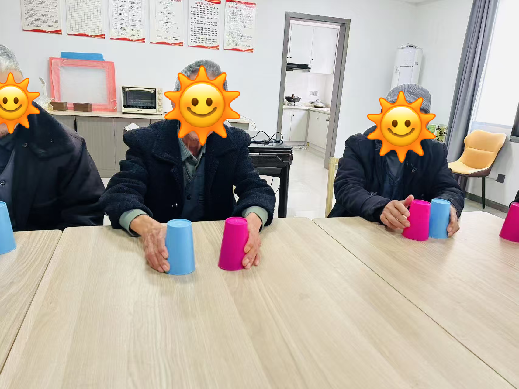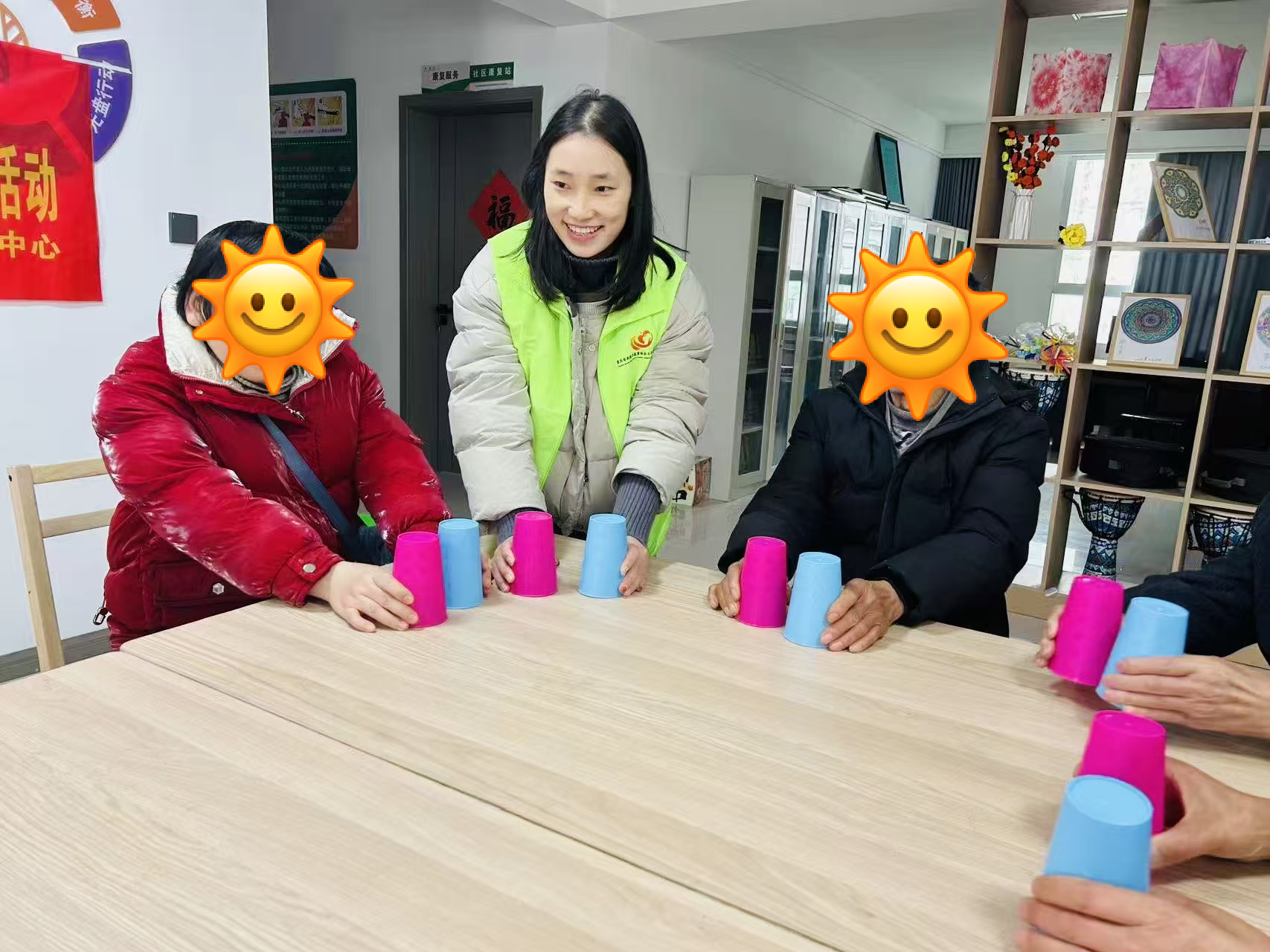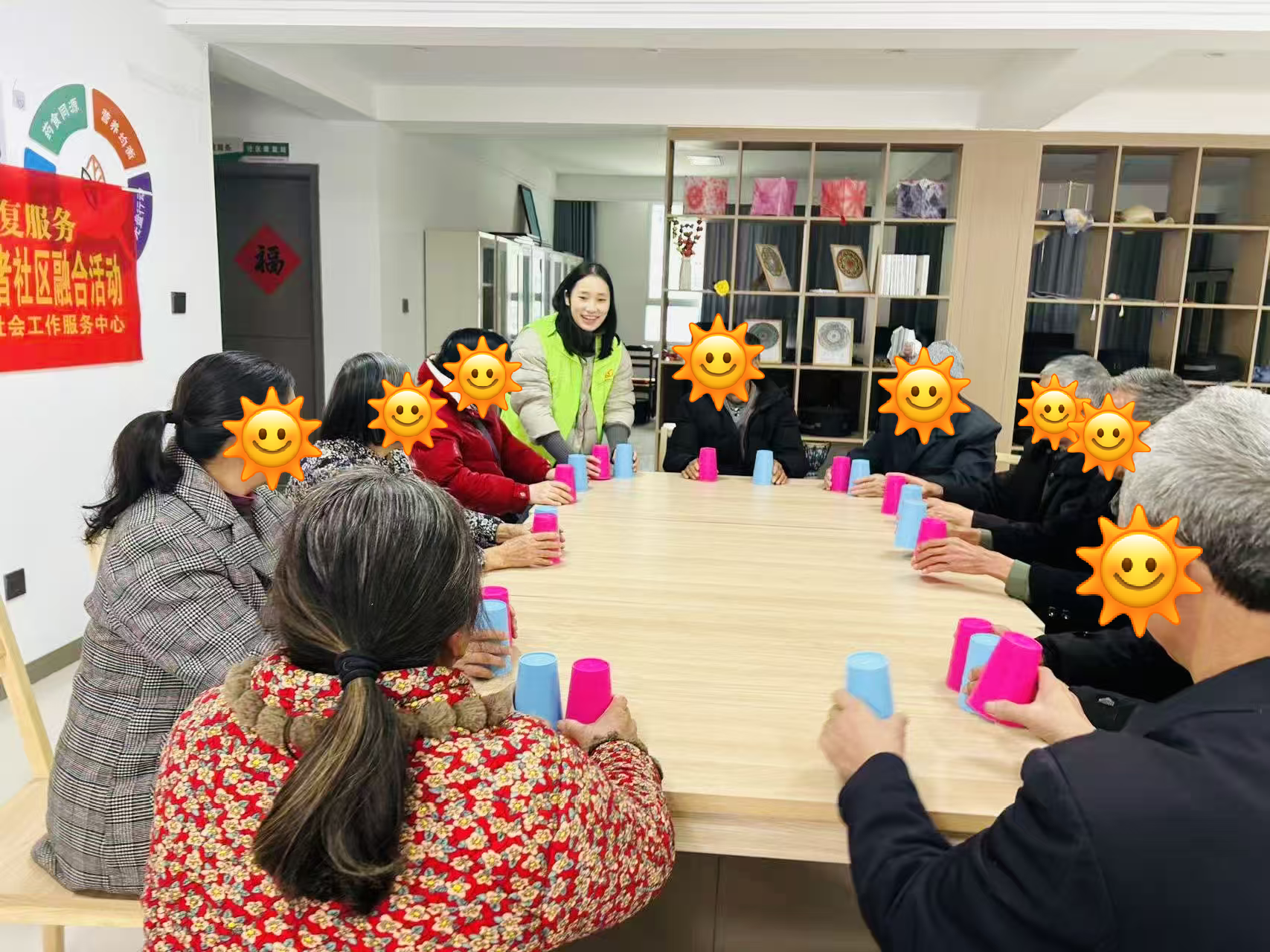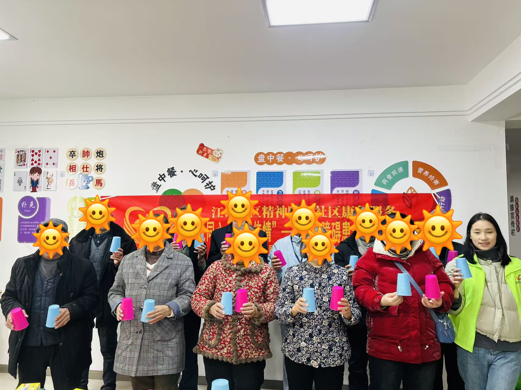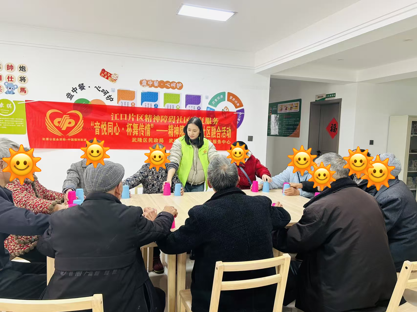 活动伊始,在轻快舒缓的音乐声中,参与者们手拉手围成圆圈,随着旋律自然地踏步、转动,彼此的手掌传递着温度与支持。随后,社工为每人分发两只色彩明亮的塑料杯,以生动有趣的方式分解教学:从简单的“拍手-敲杯底”节奏,到逐步进阶的“杯子传递与换色组合”,社工穿梭其间,用耐心的一对一指导帮助康复者掌握动作要领。当熟悉的伴奏再次响起,所有人默契地举起杯子,跟随节拍敲击、旋转、传递,原本零散的动作汇聚成整齐有力的集体舞姿——杯子的清脆声响与笑声交织,康复者们在完成表演后自发鼓掌,眼中闪烁着自信与成就感,这一刻,音乐与舞蹈真正成为了连接心灵的桥梁。